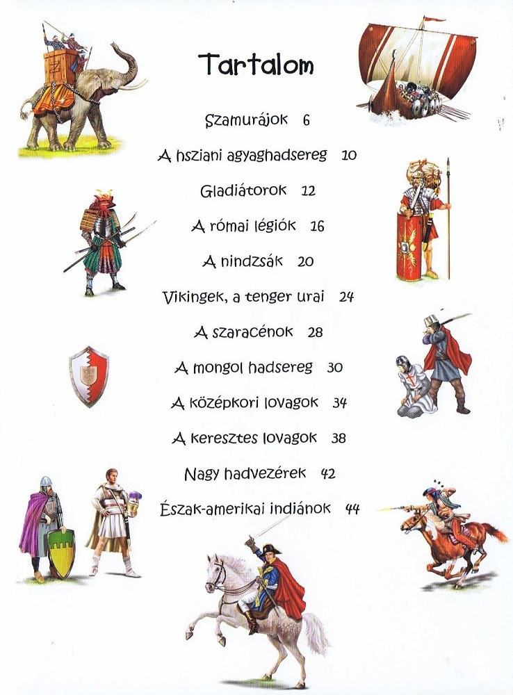 Miért voltak szinte legyőzhetetlenek a római légiók? Hogyan tudtak félmeztelenül harcolni a vikingek? Milyen fegyverekkel küzdöttek a rejtélyes nindzsák? Milyen harcmodoruk volt a mongoloknak? Kik voltak a legnagyobb hadvezérek? Ez csak néhány kérdés ebből a könyvből, amelybe rengeteg érdekességet és meglepő tényt gyűjtöttünk össze sok-sok képpel, hogy jobban megismerhesd a történelmet átalakító nagy hadseregeket, jellegzetesebb fegyvereiket és vezetőiket.