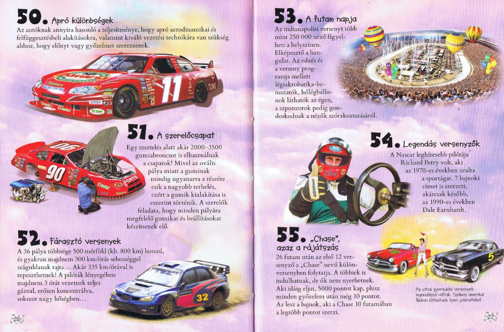 Formula-1, MotoGP, Rali, Kamionversenyek... Se szeri, se száma a látványos technikai sportoknak, amelyek közül mindenki megtalálja a szívének kedves szakágat. Könyvünk segít eligazodni a különféle versenyek között, bemutatja a fontosabb pályákat, a versenyzéssel járó élvezeteket és veszélyeket, de a legjobb pilótákat is. Mindebben sok-sok kép segít azoknak a gyerekeknek, akiket már magához vonzott a benzingőz.