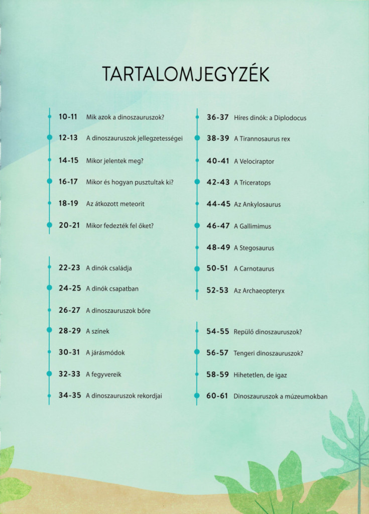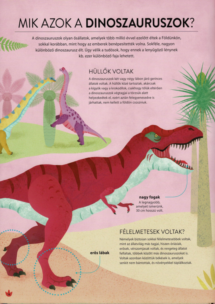 A A dinók világa egy olyan ismeretterjesztő könyv, amely izgalmas utazásra hív a dinoszauruszok elképesztő világába. Ezek az óriási lények több millió évvel ezelőtt éltek bolygónkon, és mindmáig lenyűgözik az embereket a méretükkel, erejükkel és misztikus múltjukkal. A könyv bemutatja a dinoszauruszok különféle fajtáit, beleértve a legfélelmetesebb ragadozókat, mint a Tyrannosaurus rex, valamint a legbékésebb növényevőket, mint a Diplodocus. Mindezt gyönyörű illusztrációk és tudományos tények kíséretében.
