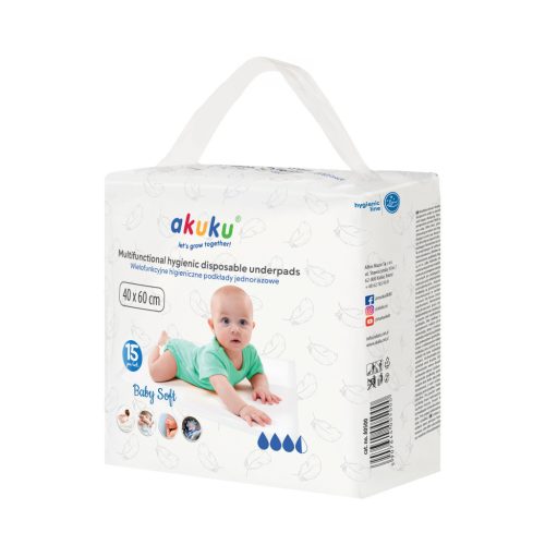 Az AKUKU eldobható higiénikus alátét ideális megoldás kisbabák pelenkázásához vagy bármely helyzethez, ahol tiszta és kényelmes felületre van szükség. Mérete 40 x 60 cm, amely elegendő teret biztosít a biztonságos használathoz. A csomag 15 darab alátétet tartalmaz, így hosszú ideig biztosítja a kényelmet és a higiéniát.