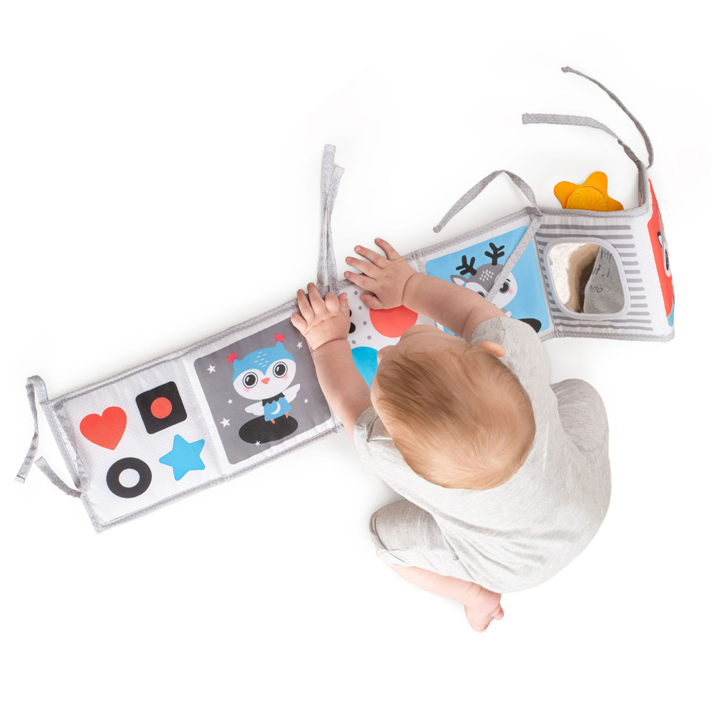 • Színes könyv, amely stimulálja a szemet és ösztönzi a hasonfekvést, babakocsiban, kiságyban vagy padlón lévő játékként használható