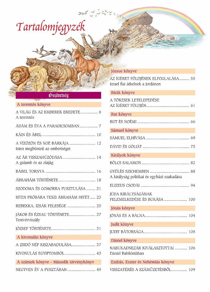 Ebben a gyönyörű könyvben a Biblia történetei elevenednek meg: a világ teremtése, Noé bárkájának és Bábel tornyának építése, József csodás álomfejtése, Mózes hősiessége, ahogy népét kivezeti Egyiptomból, az angyali üdvözlet, Jézus születése és gyerekkora, tanításai, halála és feltámadása. Ezek a történetek mindenkihez szólnak: nemcsak mesélnek, hanem tanítanak is a szeretetről, a bátorságról, az igazságról és a reményről.