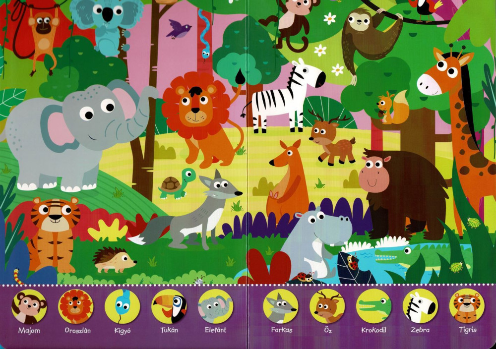 Ismerkedj meg az állatvilág lakóival! Böngéssz az oldalakon, keresd meg őket a képeken, majd a hangmodul segítségével hallgasd meg a hangjukat is. Így tényleg móka az ismerkedés!