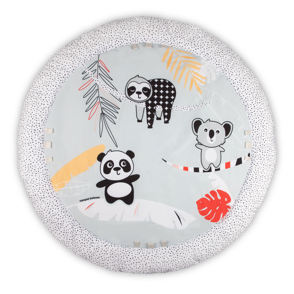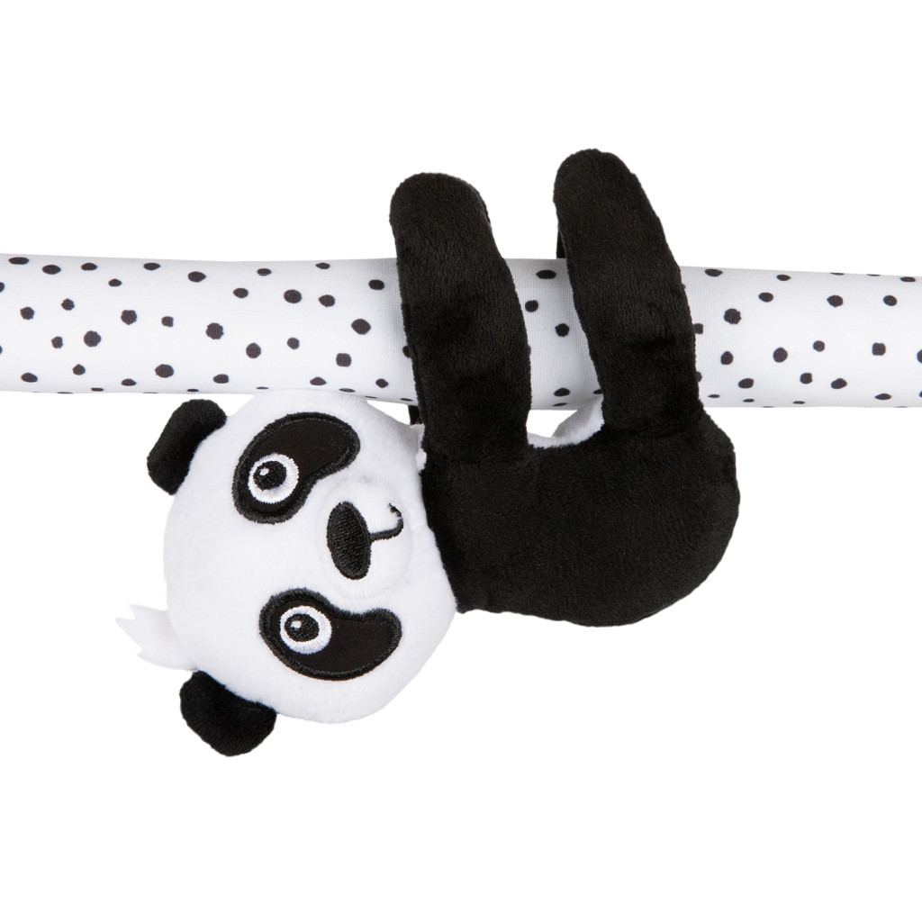 • A zörgő és tépőzáras mancsokkal ellátott panda rögzíthető a játszószőnyeg vagy a kiságy ívein is
