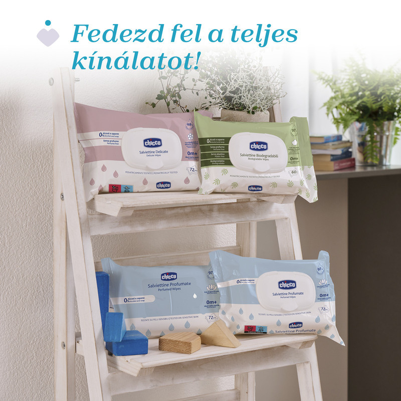 Chicco biológiailag lebomló törlőkendő – tisztaság és környezetbarát gondoskodás egyben! Alkohol-, szappan- és illatmentes, puha kendők kezekre, arcra és intim területekre, születéstől használható. Pantenollal, E-vitaminnal és gyapotkivonattal ápolják a baba bőrét, miközben a természetet is kíméled.