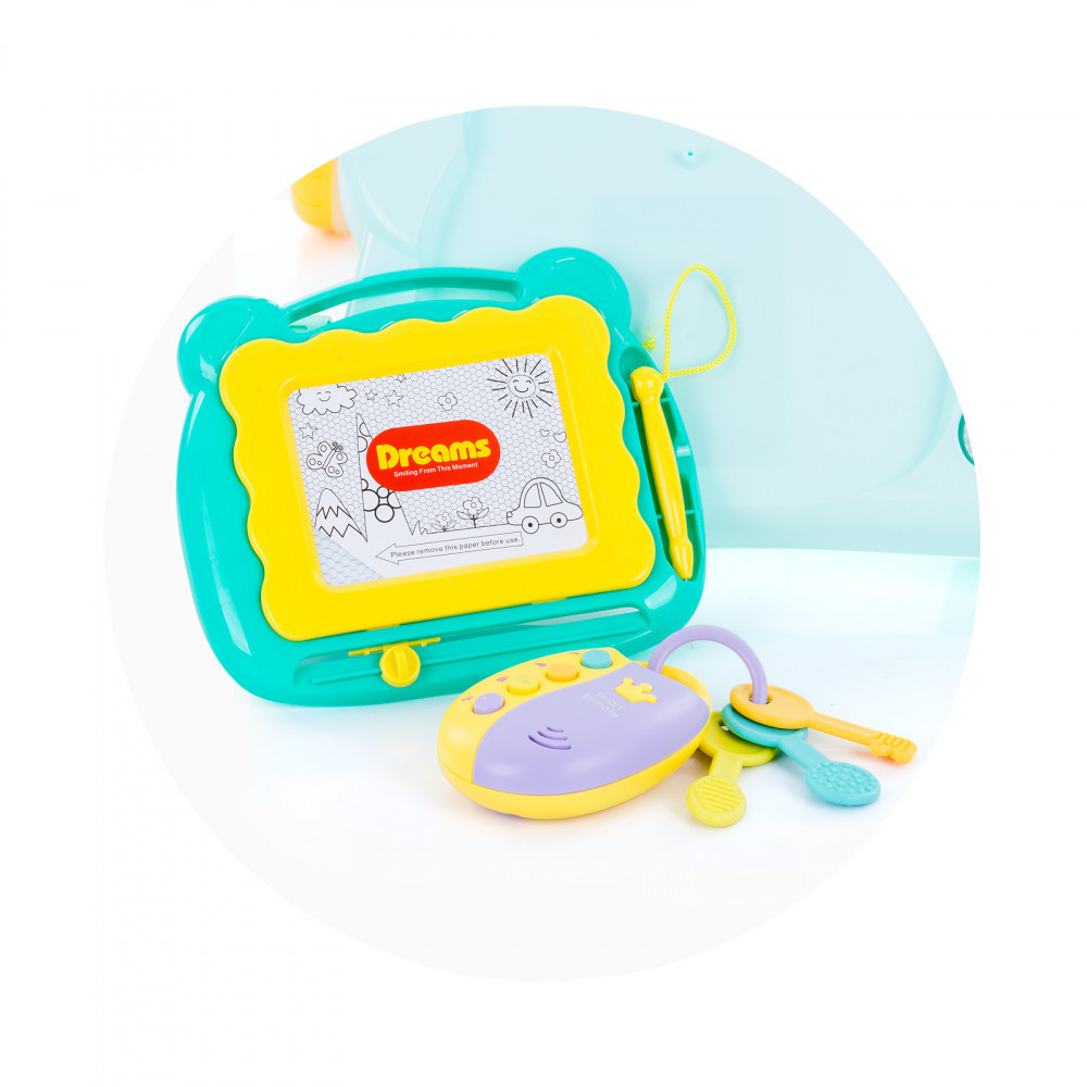 • Különböző játékok, melyek lekötik a gyermek figyelmét és fejlesztik a képességeit: mágneses rajztábla, zenélő kulcstartó, csörgők, tekerhető, nyomkodható gombok, lapozgató, babatükör