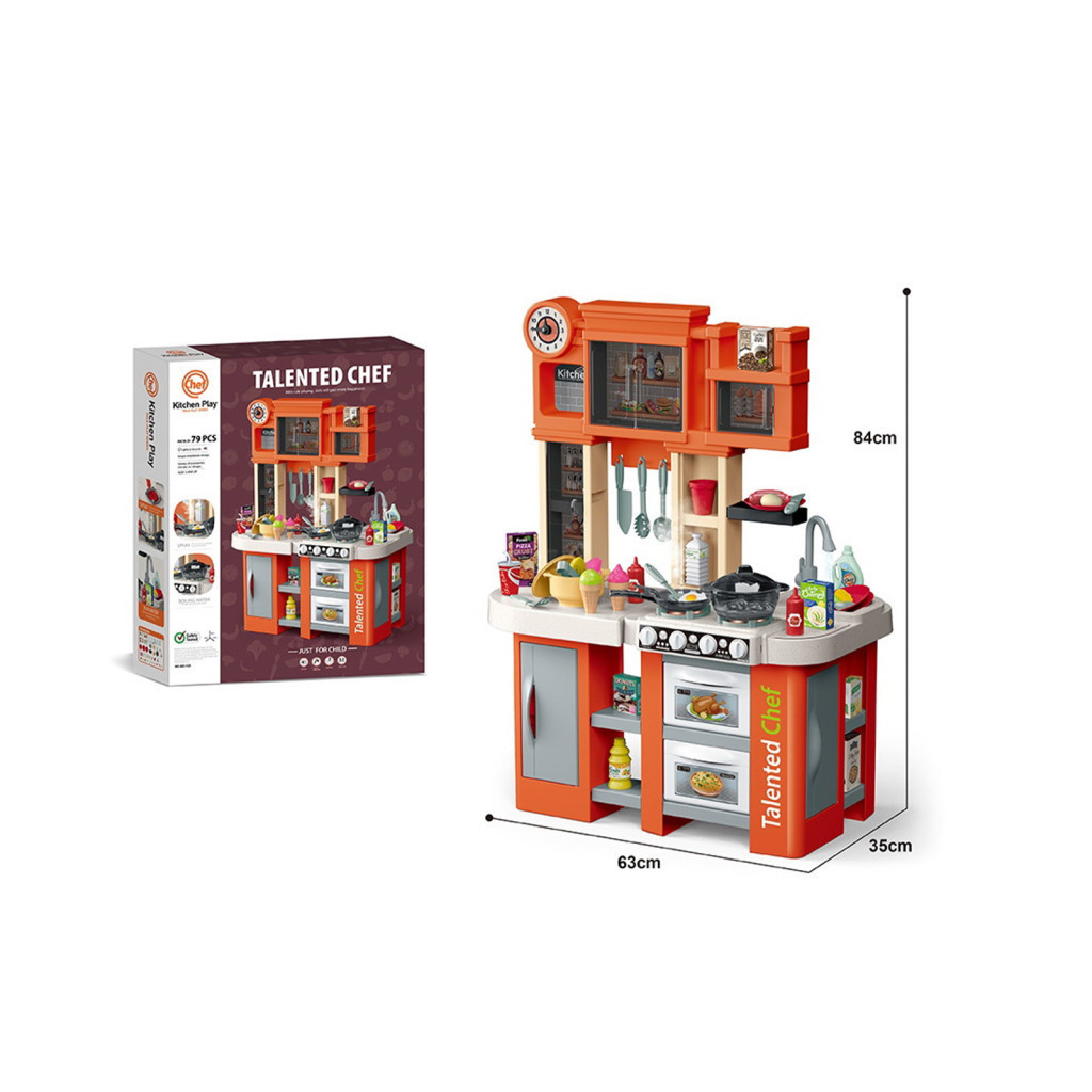 • Tartalmaz 79 különálló játékot és kiegészítőt - edényeket, csaptelepet, kiegészítő játék élelmiszereket és magát a konyhát