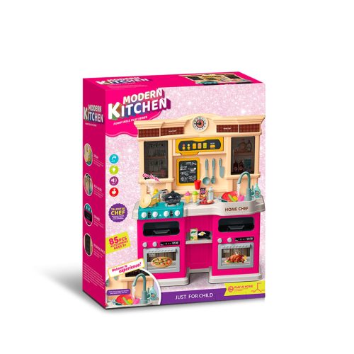 • Tartalmaz 85 különálló játékot és kiegészítőt - edényeket, csaptelepet, kiegészítő játék élelmiszereket és magát a konyhát
