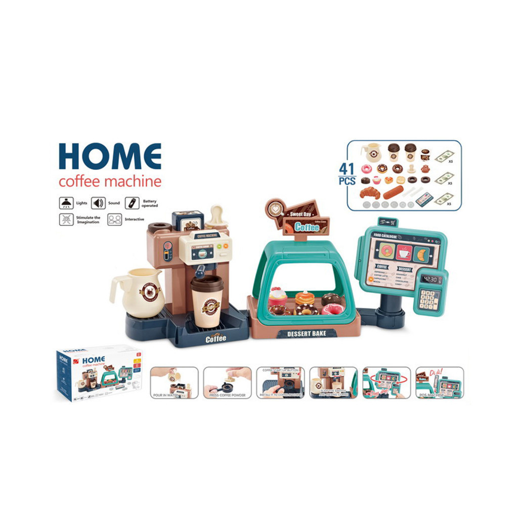• Tartalmaz 41 különálló játékot és kiegészítőt - kávéfőző víztartállyal, csészék, érmék és bankjegyek, képernyő POS terminállal, vitrin édességekkel;