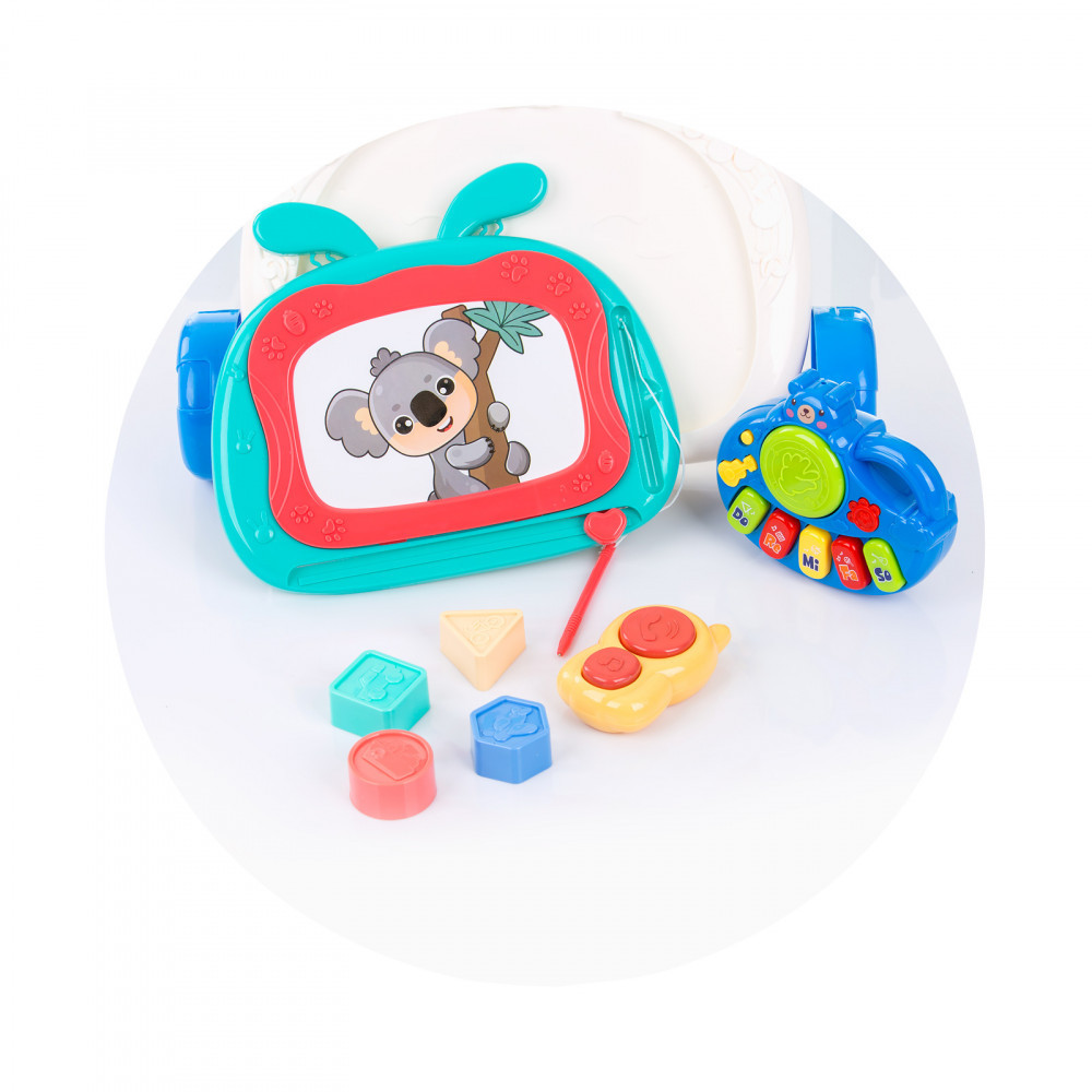 • Különböző játékok, melyek lekötik a gyermek figyelmét és fejlesztik a képességeit: mágneses rajztábla, mini pianino, csörgők, tekerhető, nyomkodható gombok, formakereső játék.