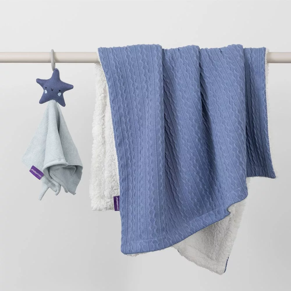 A ClevaMama sherpa babatakaró egy puha, kényelmes kötött takaró, melynek egyik oldalán finom, fonott mintázatú pamut, másik oldalán pedig vastag, bolyhos Sherpa bélés található. Ideális kültéri használatra, hűvösebb napokra vagy otthoni, meghitt összebújásokhoz.