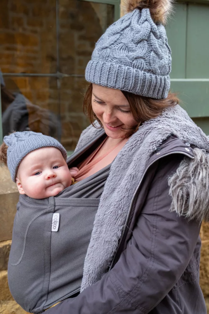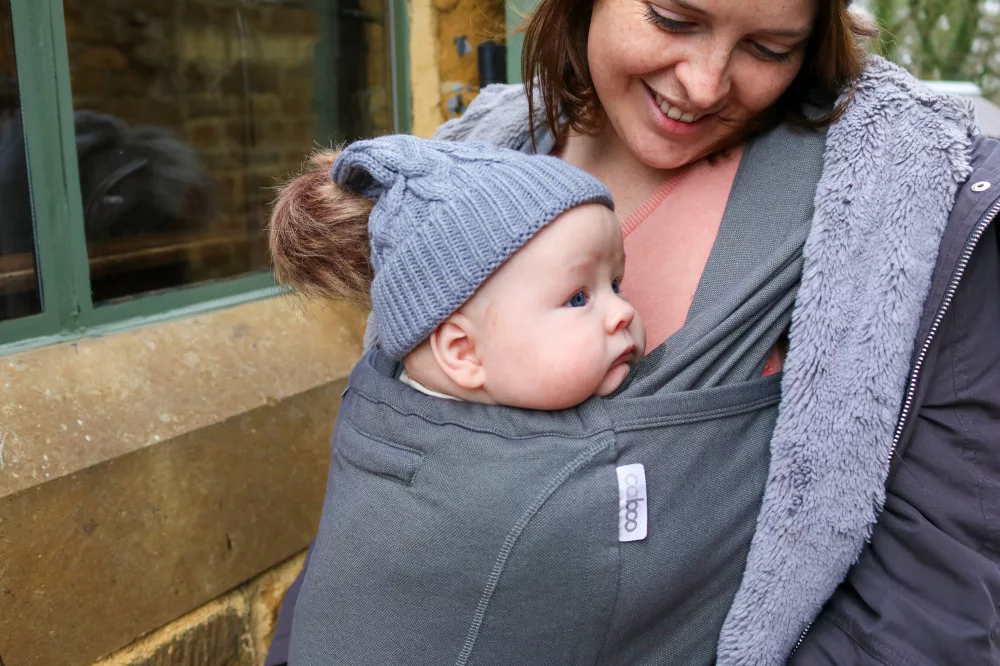 • Csípőn hordozás lehetősége a Caboo-ban nagyobb babákkal.