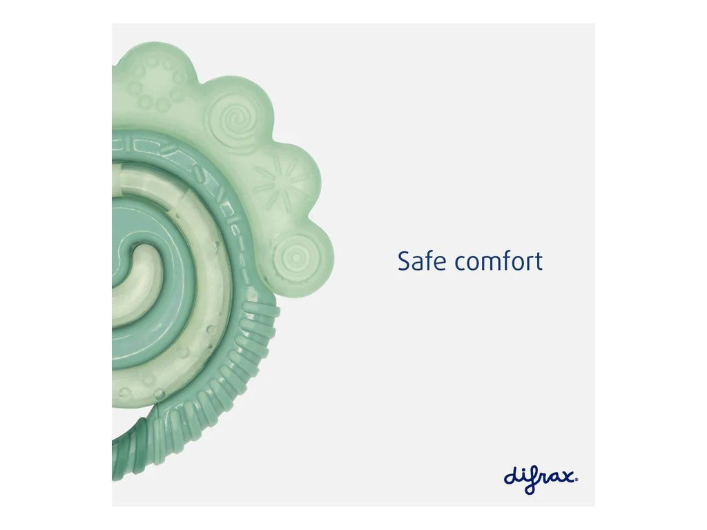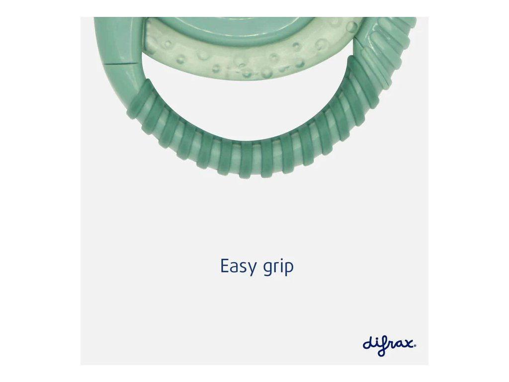 A Difrax multifunkcionális rágóka két részből áll: kemény rész és vízzel töltött rész. A kemény rész göröngyös felületének köszönhetően maszírozza az ínyt. A részben vízzel töltött rágókát lehűtheti, így segít enyhíteni a fogak növekedéséből eredő fájdalmakat.