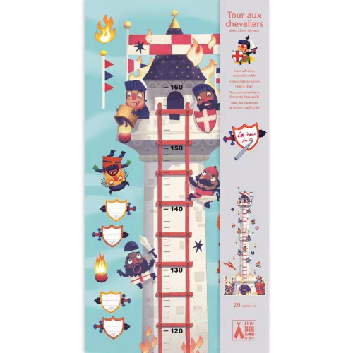A Djeco Lovagtorony magasságmérő falmatrica elhozza a középkori kastélyok hangulatát a gyerekszoba falaira! A kis lovagok és hercegnők most egy varázslatos torony mellett követhetik nyomon, mennyit nőttek – vidám, színes és játékos formában.