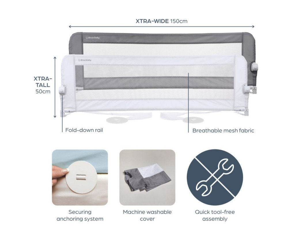 A Dreambaby Nicole leesésgátló ideális választás kisgyermekek számára, amikor a kiságyból nagyágyba való átmenet zajlik. Extra széles és magas kialakítása biztonságos érzetet ad, miközben segít megelőzni az éjszakai leeséseket.