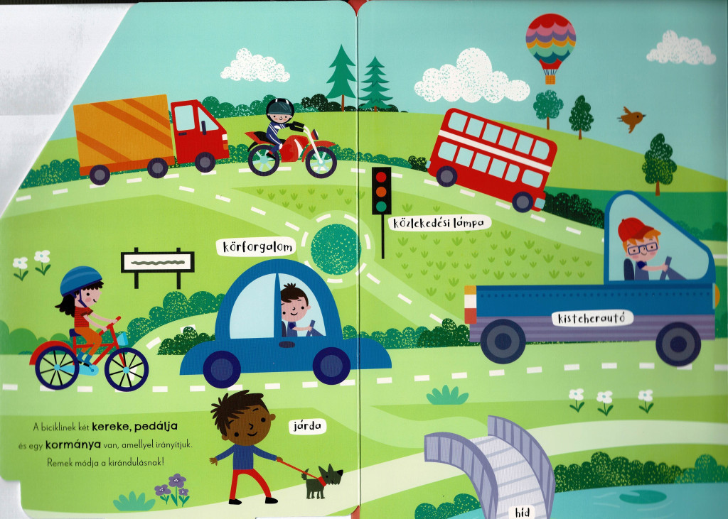 Közlekedési eszközök: A repülőgép, vonat, autó, bicikli és hajó segít megismertetni a gyerekeket a közlekedés világával.