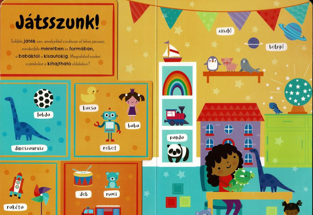 A színes illusztrációk és a kihajtható oldalak még izgalmasabbá és interaktívabbá teszik a tanulást, miközben a gyerekek figyelmét hosszabb ideig lekötik. A vizuális és auditív tanulás kombinációja segít fejleszteni a memóriát, a szókincset és az alapvető nyelvi készségeket.