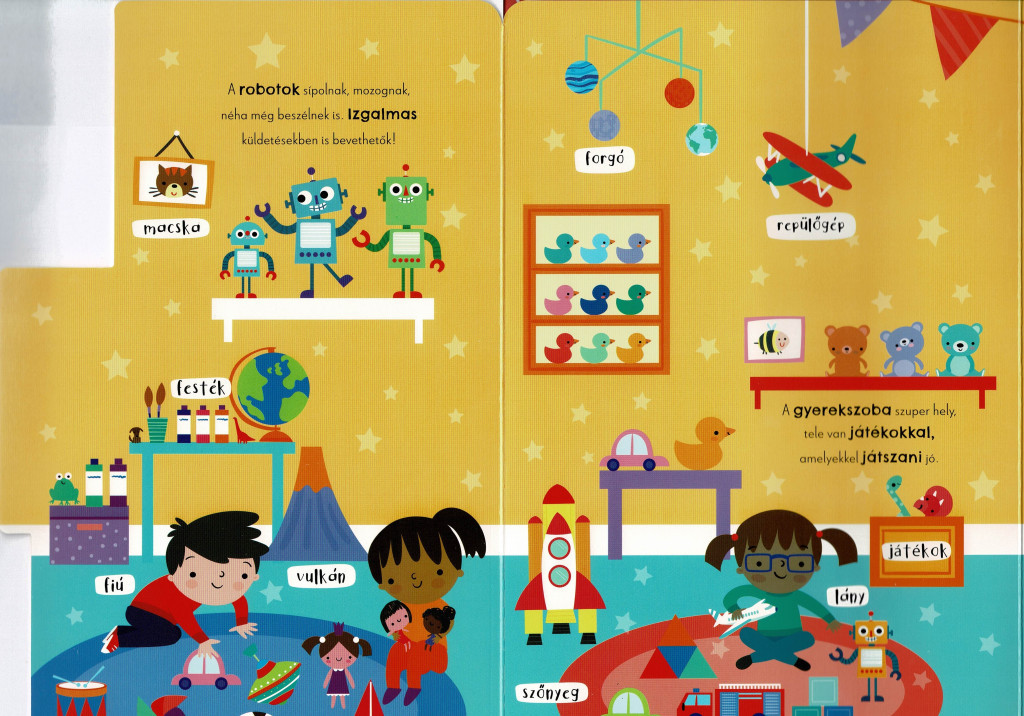 Játékok és gyerekszoba: Itt megtalálhatók a legkedveltebb játékok, mint a maci, a baba, a robot vagy a labda, valamint a gyerekszoba fontos tárgyai.