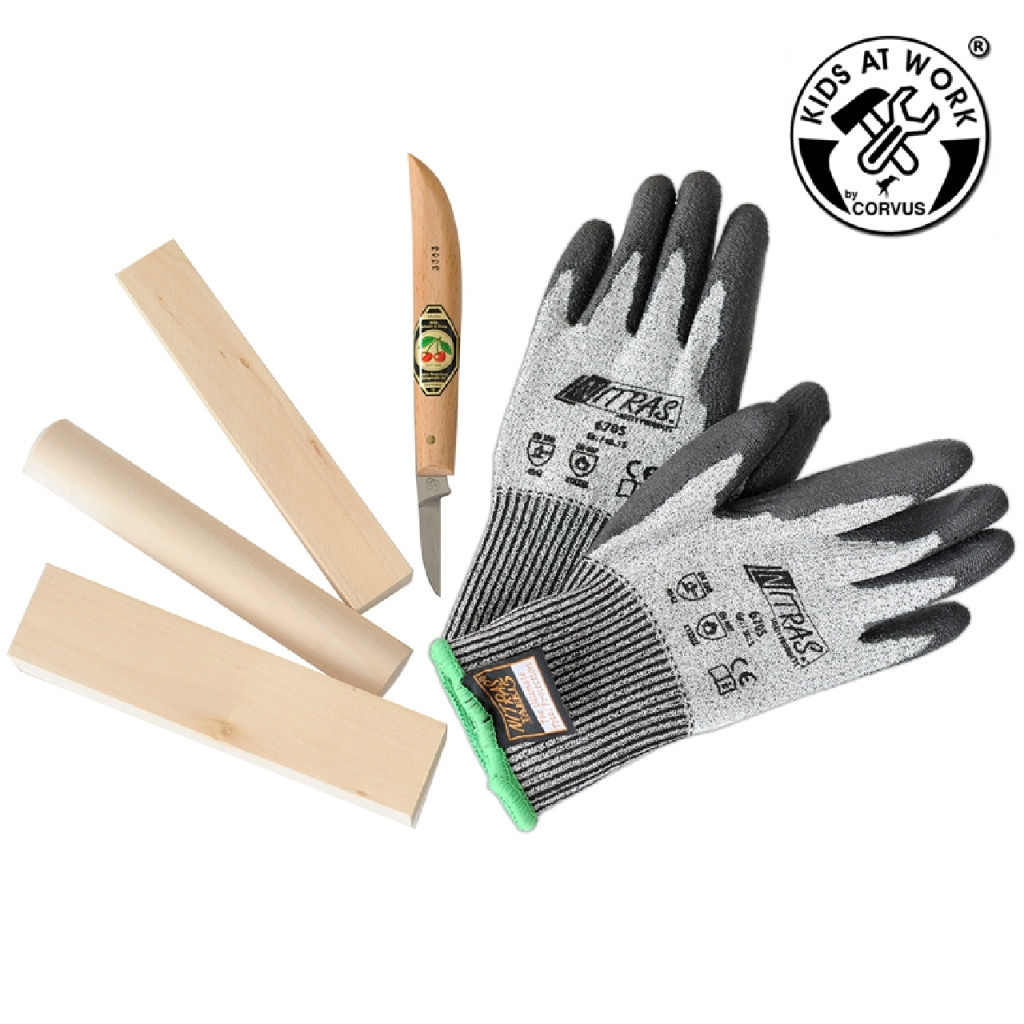 • Tartalom: 1 db faragókés, 3 db hársfa alapanyag, 1 db vágásbiztos kesztyű (XS / 5-ös méret)
