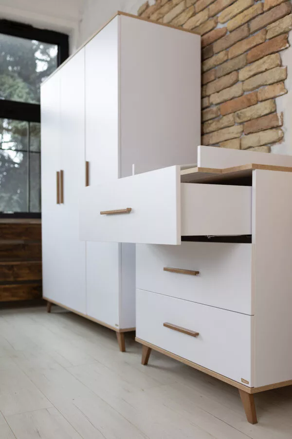 A FLIP komód nemcsak szemet gyönyörködtető látvány, hanem praktikus tárolóbútor is a mindennapokhoz. A három darab, egyenként 46 literes fiók bőséges helyet kínál a pelenkáktól kezdve a ruhácskákig – hiszen tudjuk, egy babaszobában sosem lehet elég tárolóhely. A pelenkázó toldalék könnyedén eltávolítható, így a komód hosszú távon is használható, stílusos bútordarabként ékesíti az otthonod.