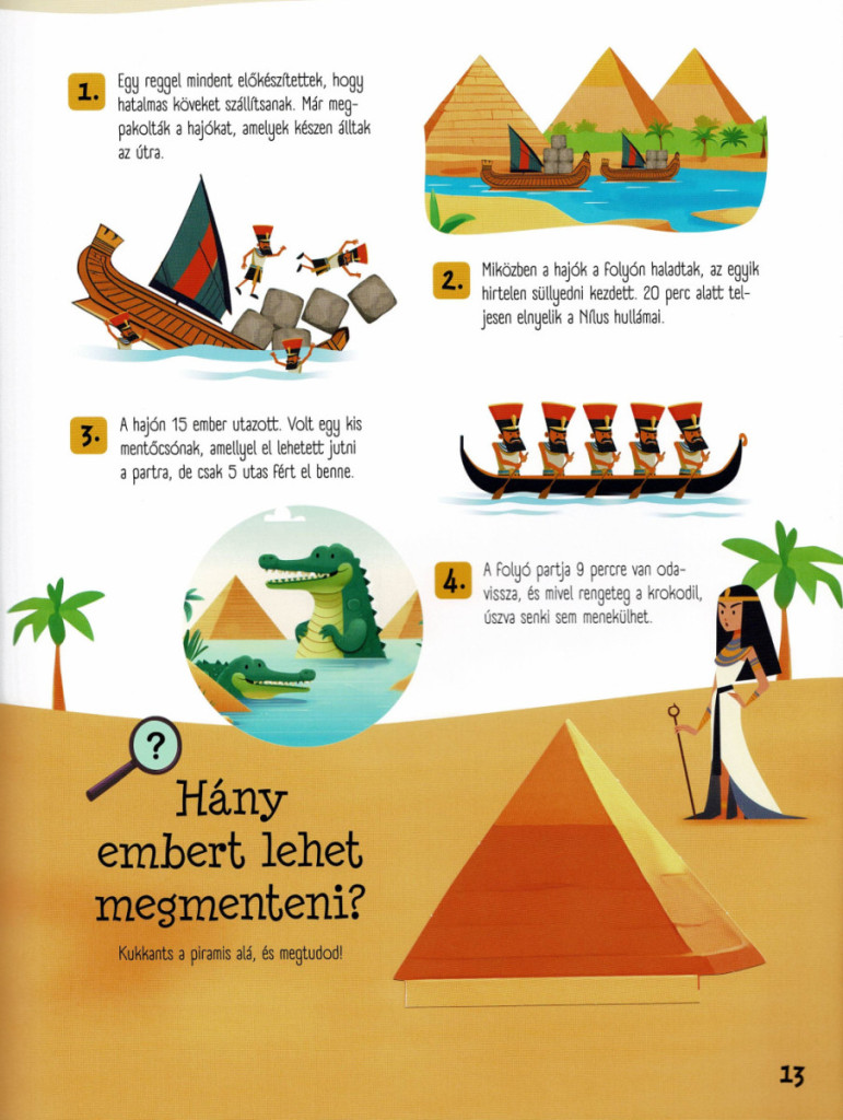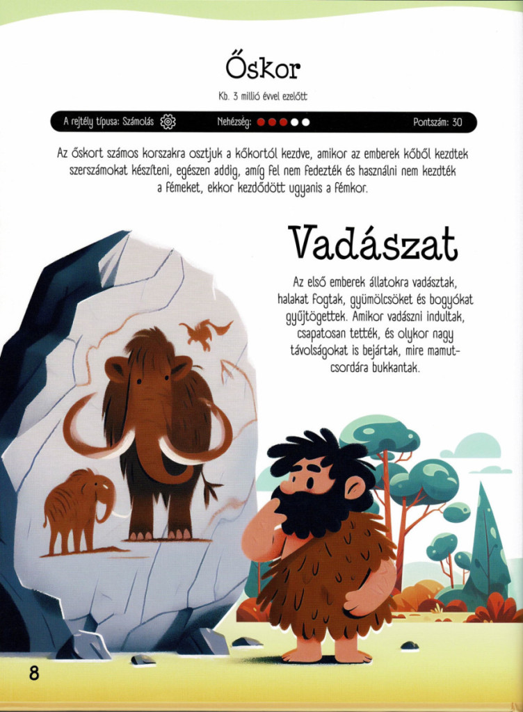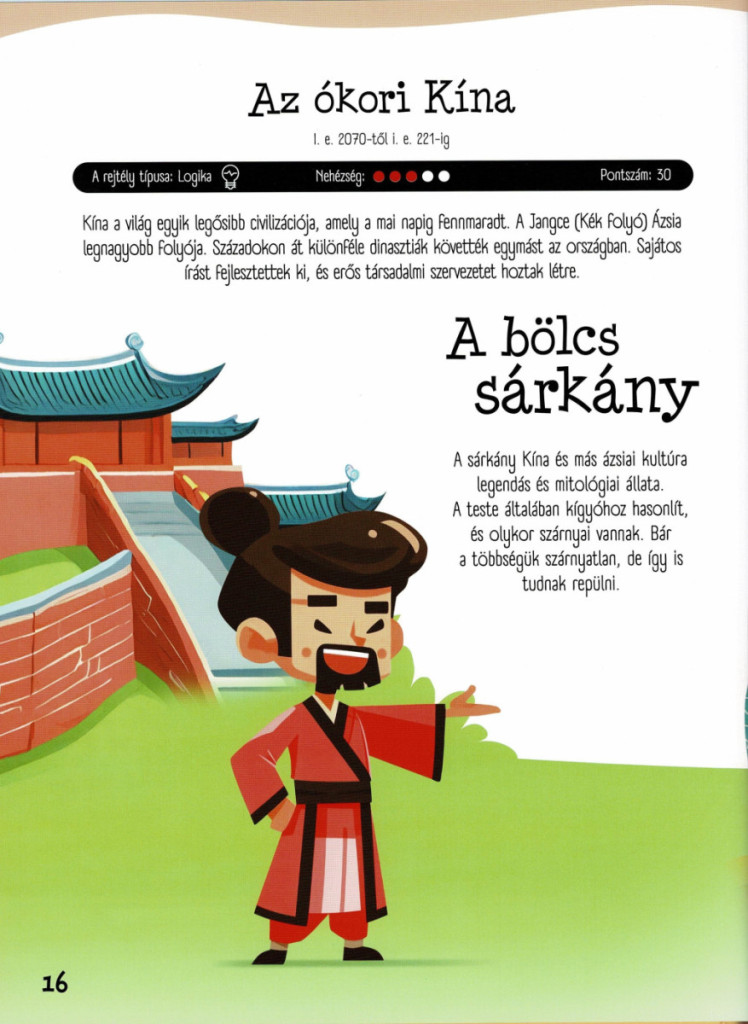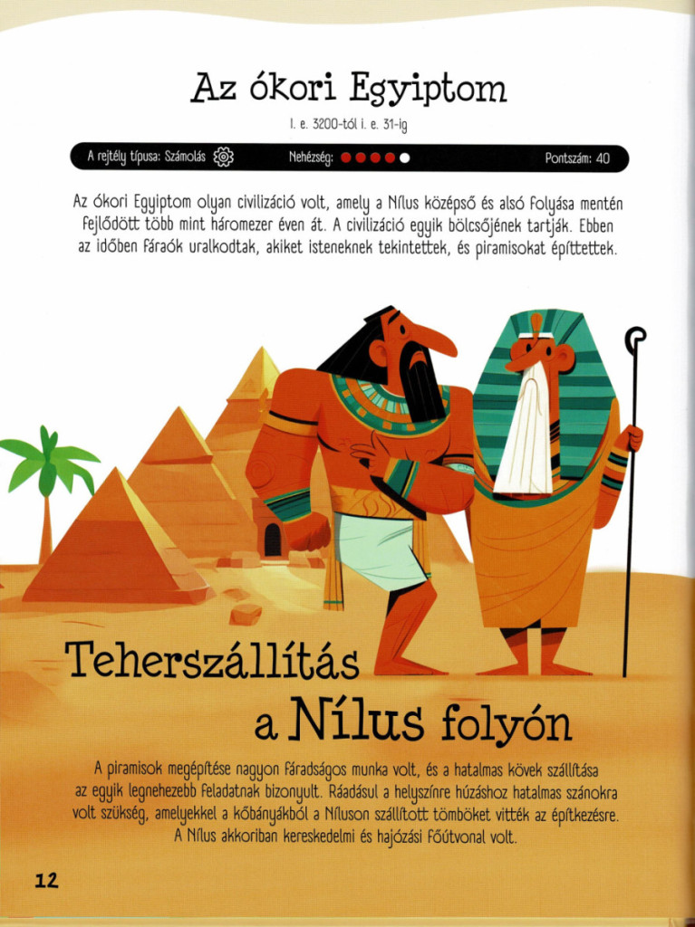 Ez az izgalmas kiadvány a történelem világába kalauzol, méghozzá nem is akárhogyan: minden korszakban egy-egy rejtéllyel, logikai feladvánnyal, fejtörővel vagy megfigyelőképességet igénylő kihívással találkozik az olvasó. A cél nem csupán a szórakozás, hanem az is, hogy a gyerekek játékosan, élményszerűen fedezhessék fel az emberiség múltját – a barlangrajzoktól kezdve egészen a modern korokig.