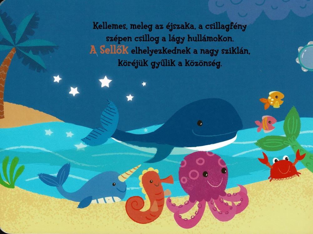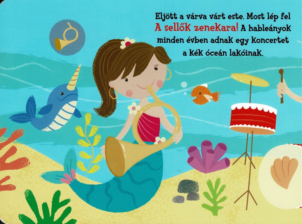 A sellők zenekarában Erika, Anikó, Dóri és Emma játszik. Fantasztikus muzsikusok, csodálatos koncertet adnak. A hangmodul segítségével keresd meg, hogy a sellők melyik hangszeren játszanak és a mese olvasása közben hallgasd meg a hangjukat.