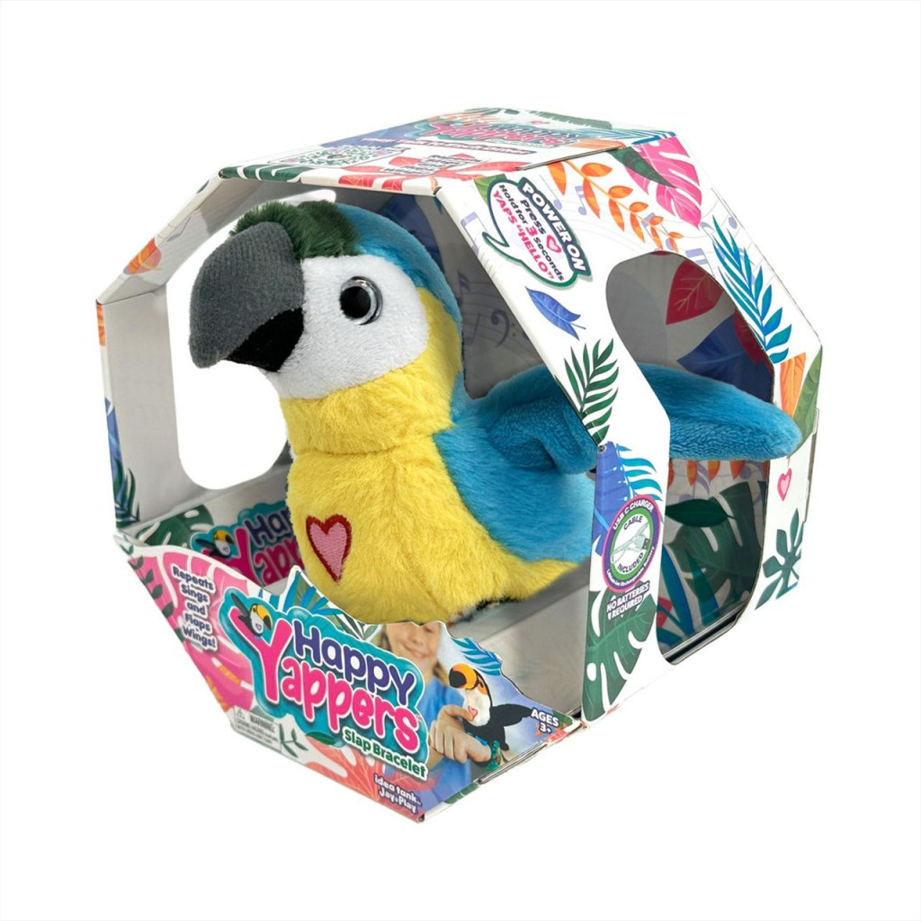 A legszínesebb madarak repkedő rajához most te is csatlakozhatsz! A Happy Yappers interaktív plüss madarakat a pánt segítségével könnyen a csuklódra ülnek. Csak nyomd meg a szívecskét a mellkasukon, és máris indulhat a közös játék! Ezek a madarak csiripelnek, énekelnek, beszélnek hozzád, és akár meg is ismétlik, amit mondasz.