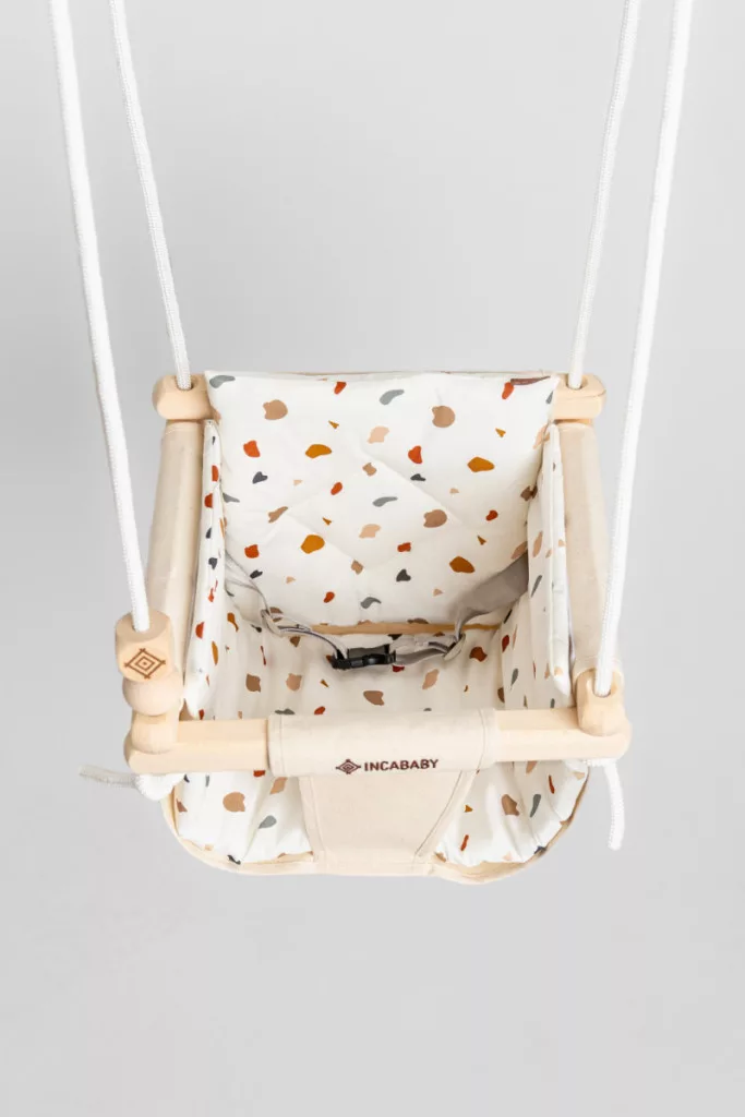 • A csomag tartalmazza: Tépőzáras hintabélés (kivehető, mosható), Puha párna (nyak- és háttámasz), 2 pontos biztonsági öv, Készségfejlesztő bükkfa golyó és kocka
