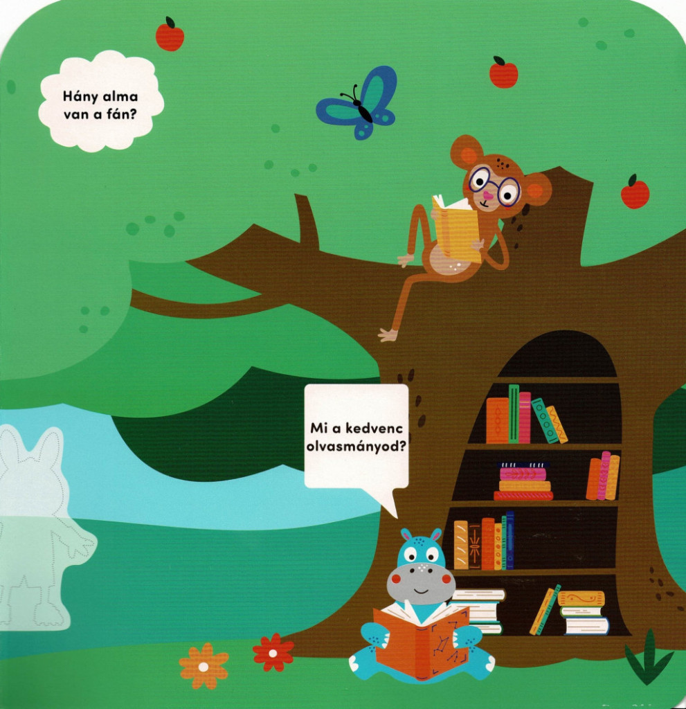 A kötethez tartozó újrahasználható matricák révén a gyerekek saját jeleneteket állíthatnak össze: hol a majom a legjobb tanuló, hol a víziló felel a táblánál, máskor a teknős bújik a könyvei mögé. A matricák bárhová ragaszthatók a könyv oldalain – vagy akár más sík felületeken is –, majd könnyedén visszaszedhetők és újrahasználhatók, így minden olvasás egy új játékélménnyé válik.