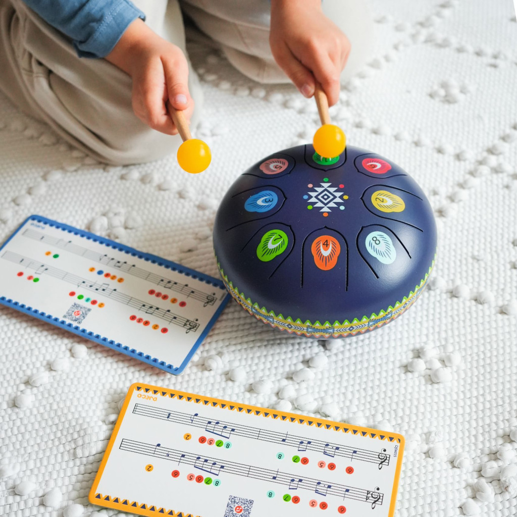 Fedezd fel a lágy dallamok varázsát ezzel a Djeco rezgőnyelves acéldobbal! Az indián motívumokkal díszített hangszer 8 különböző hanggal vár, így könnyedén alkothatsz megnyugtató, pihentető dallamokat. A két ütőpálcával a gyerekek saját ritmusukat hozhatják létre, miközben fejlesztik hallásukat, finommotorikájukat és zenei érzéküket.