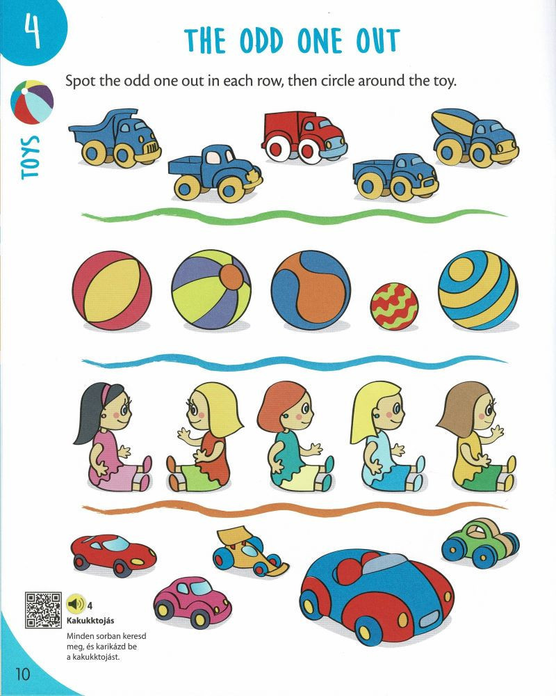 A könyv változatos és érdekes feladatokat tartalmaz, amelyek mindegyike az angol nyelv alapjainak elsajátítására összpontosít. A szókincsfejlesztő feladatok segítenek a gyerekeknek megismerkedni az alapvető angol szavakkal, míg a logikai és problémamegoldó gyakorlatok fejlesztik a gondolkodásukat. A koncentrációs feladatok pedig abban segítenek, hogy a gyerekek megtanuljanak hosszabb ideig egy dologra figyelni, ami elengedhetetlen az iskolai sikerhez. A színes illusztrációk és a játékos feladatok biztosítják, hogy a gyerekek élvezettel végezzék el a feladatokat.