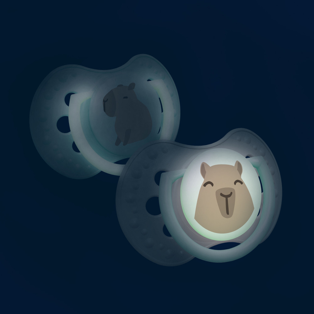 A szett 2 cumit tartalmaz – az egyik cumi fogantyúja, a másik középrésze világít a sötétben.