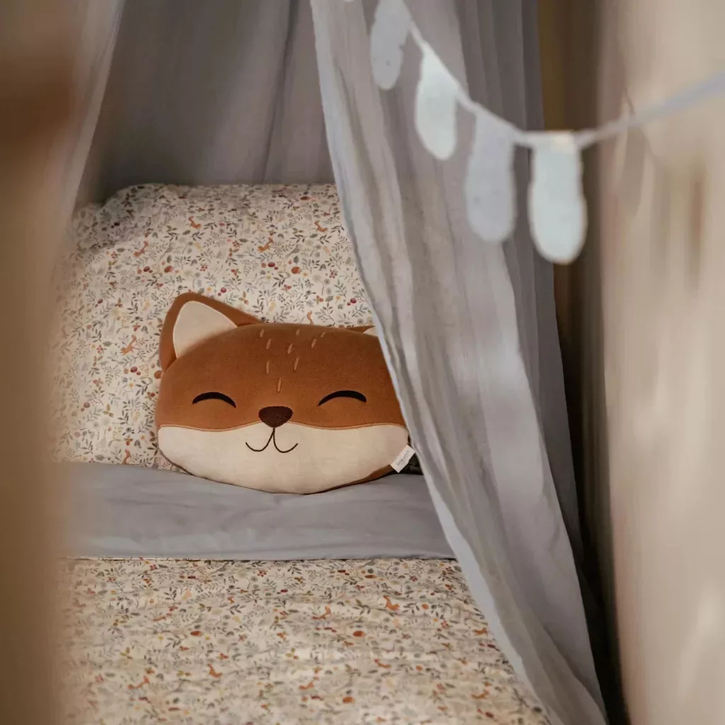 Ez a kötött róka párna puha, kényelmes és igazi társ lehet a mindennapokban. A finom hímzett részletek különleges bájt kölcsönöznek neki, a 100% organikus pamut huzat pedig gyengéd a baba bőréhez és környezetbarát választás.
