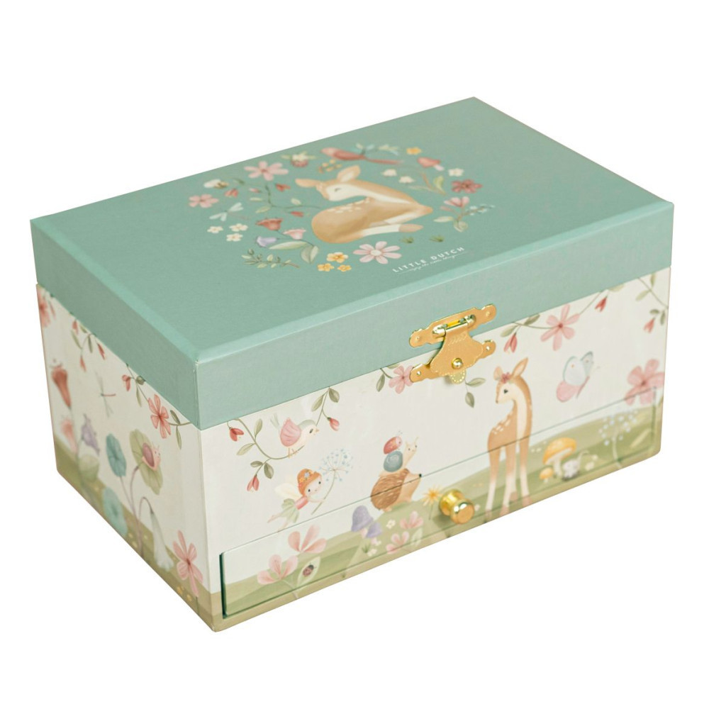 A Little Dutch zenélő ékszerdoboz nemcsak gyönyörű, hanem tele van meglepetéssel is! Csak nyisd ki, és máris felcsendül a lágy dallam, miközben egy bájos kis őzike forog a tükör előtt. Tökéletes hely a legféltettebb kincsek, gyűrűk, hajcsatok és apróságok számára.
