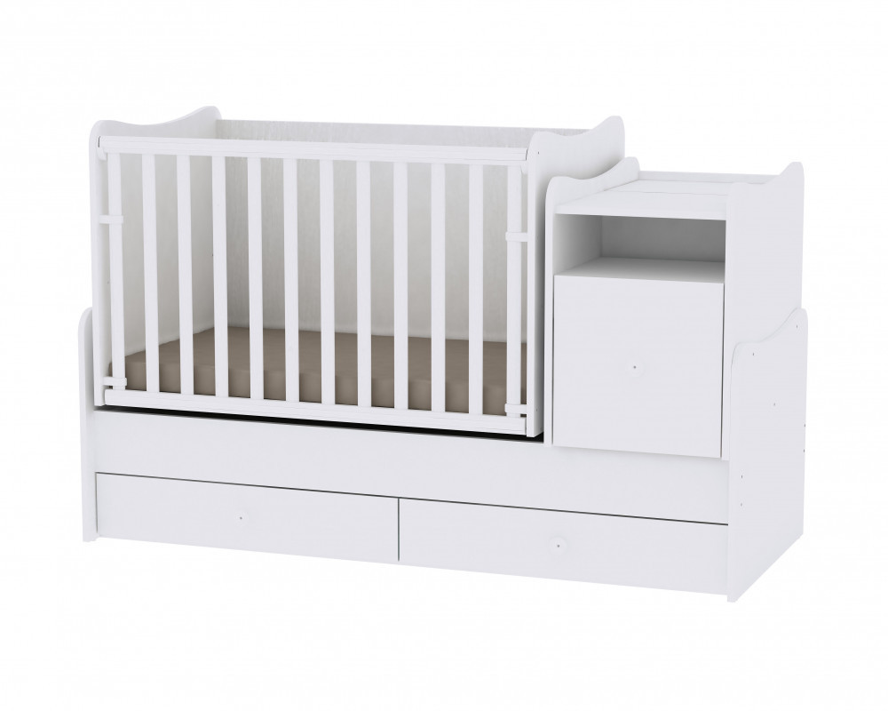 • Szuper megoldás, hogy a kiságy és a komód összetartozik, így nem kell két külön bútordarabot vásárolni. Amikor már nincs szükség rácsos kiságyra, a komód és a rácsok levételével egyszerűen át lehet alakítani ifjúsági heverővé és éjjeliszekrénnyé.
