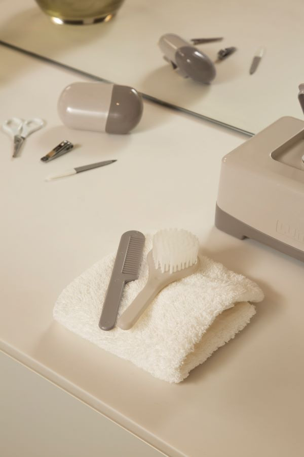 • Fésű: ergonomikus, lekerekített fogak, nem irritálja a baba fejbőrét, könnyen tisztítható