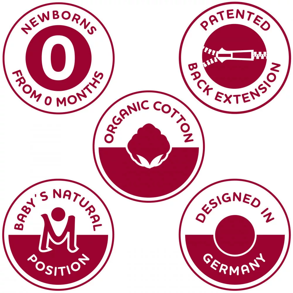 • Az újszülött szűkítőt egy forradalmi újítás váltotta fel: fokozatmentesen, könnyedén állítható a terpesz szélesség (16 cm-től 50 cm-ig), így újszülött kortól totyogó korig használható a hordozó a terpesz szélesség állíthatóságának köszönhetően.
