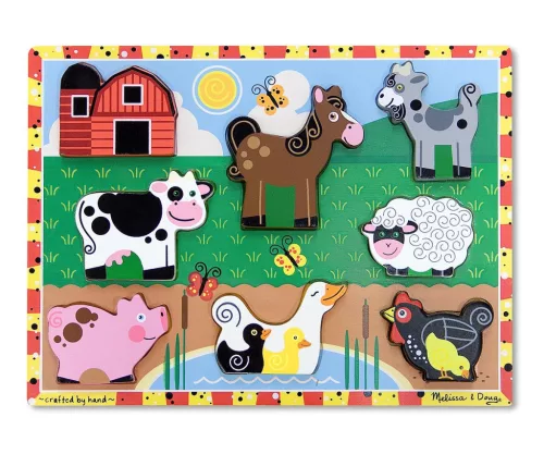 Élvezd a farm nyújtotta szabadság minden pillanatát ezzel az extra vastag fából készült, farmállatokat ábrázoló puzzle játékkal. A táblán 8 színes kép segíti gyermekedet a párosításban. 7 könnyen megfogható háziállat alakzat és egy pajta puzzle elemet is tartalmaz. Szem-kéz koordináció, valamint finommotorika fejlesztésére rendkívül alkalmas.