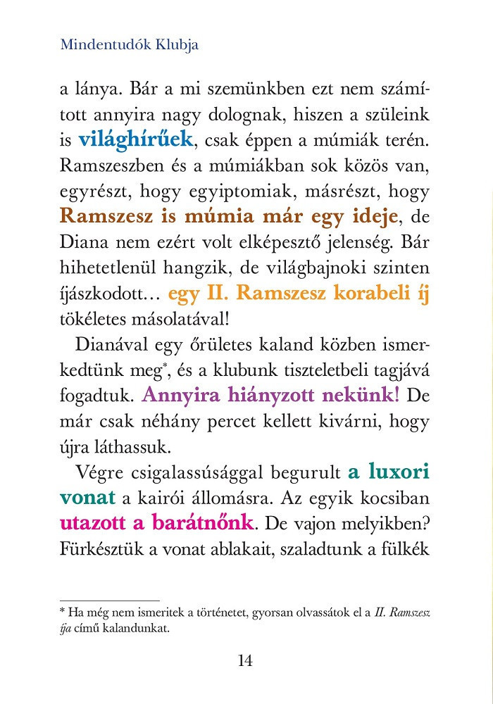 Mi történik, ha egy régészházaspár meghívást kap egy ásatásra? Természetesen viszik magukkal a gyerekeiket is! Igen ám, de mihez kezd magával három kisgyerek Egyiptomban vagy éppen Párizsban? Természetesen rejtélyek után kutatnak! Ebben a történetben újra teljes a létszám a Mindentudók Klubjában: Diana Fischer újra csatlakozik a barátaihoz, hogy egy hajmeresztő kalandban óvják meg Ehnaton fáraó múmiáját a rá leselkedő veszélytől.