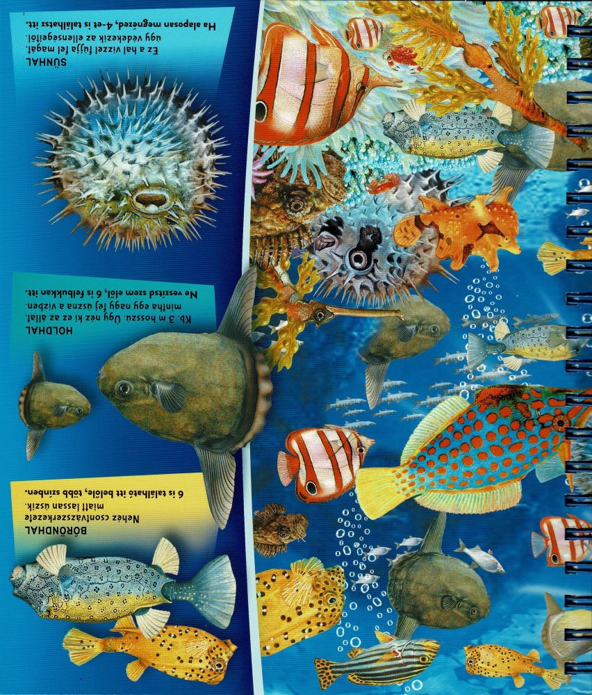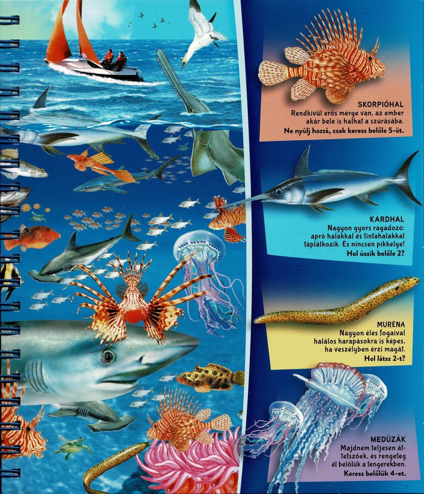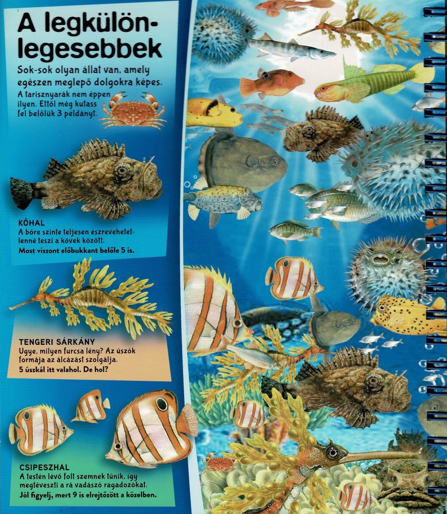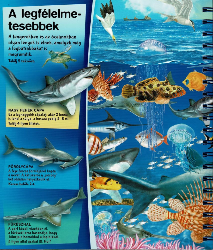 Merülj le velünk a felszín alá! Nézd, milyen csodás lények népesítik be a tengerek és óceánok világát. Vannak között kicsik és nagyok, vadak és játékosak, sőt repülni tudók is. Keresd meg mindet a képeken! Ebben a mellékelt nagyító is a segítségedre lesz.