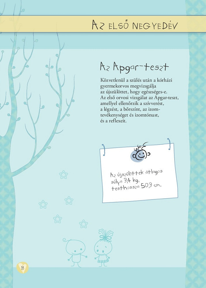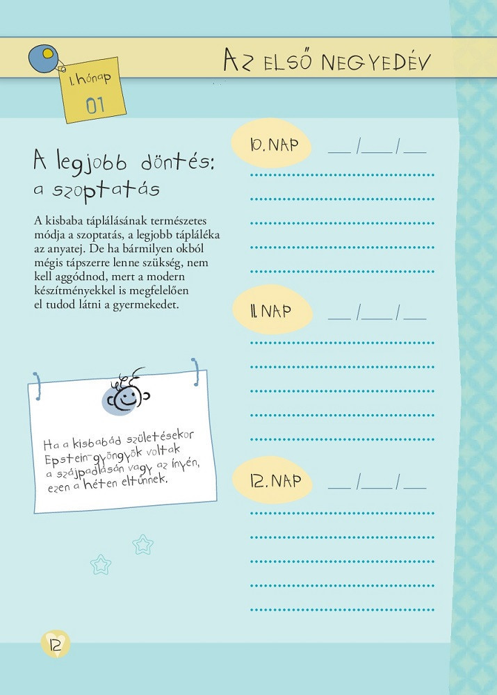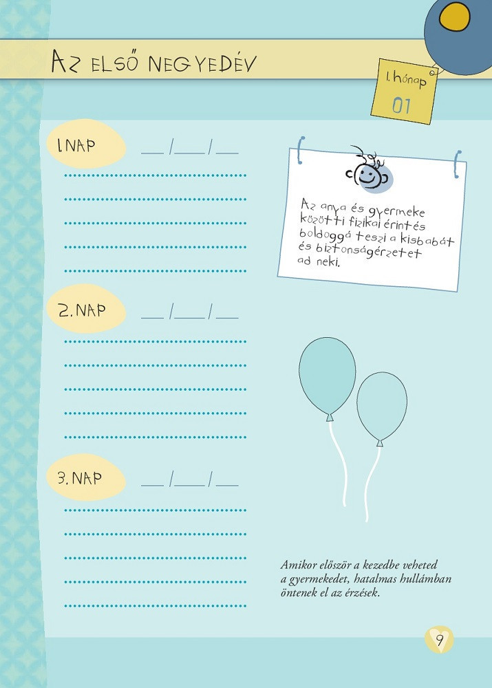 A gyermek születése hatalmas boldogságot hoz a családba. A napló segítségével megőrizheted a csöppség fejlődésének minden mozzanatát. A lapokon arról is olvashatsz, hogyan fejlődik a baba az első évben, sőt néhány hasznos csecsemőgondozási tanáccsal is igyekszünk segíteni Neked, hogy az első időszakot a lehető legkevesebb zűrrel vészelje át a család. Ez a személyes napló hasznos társad és segítőd lesz ebben a csodálatos időszakban.