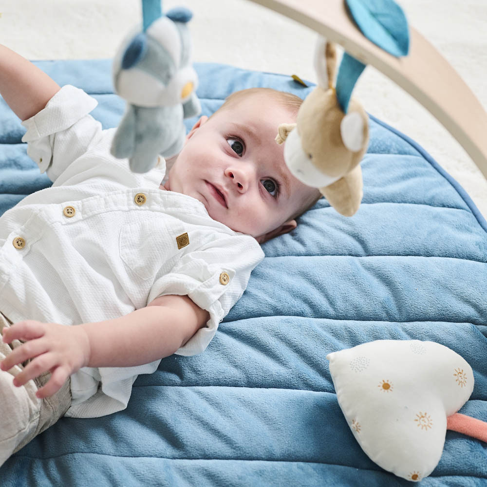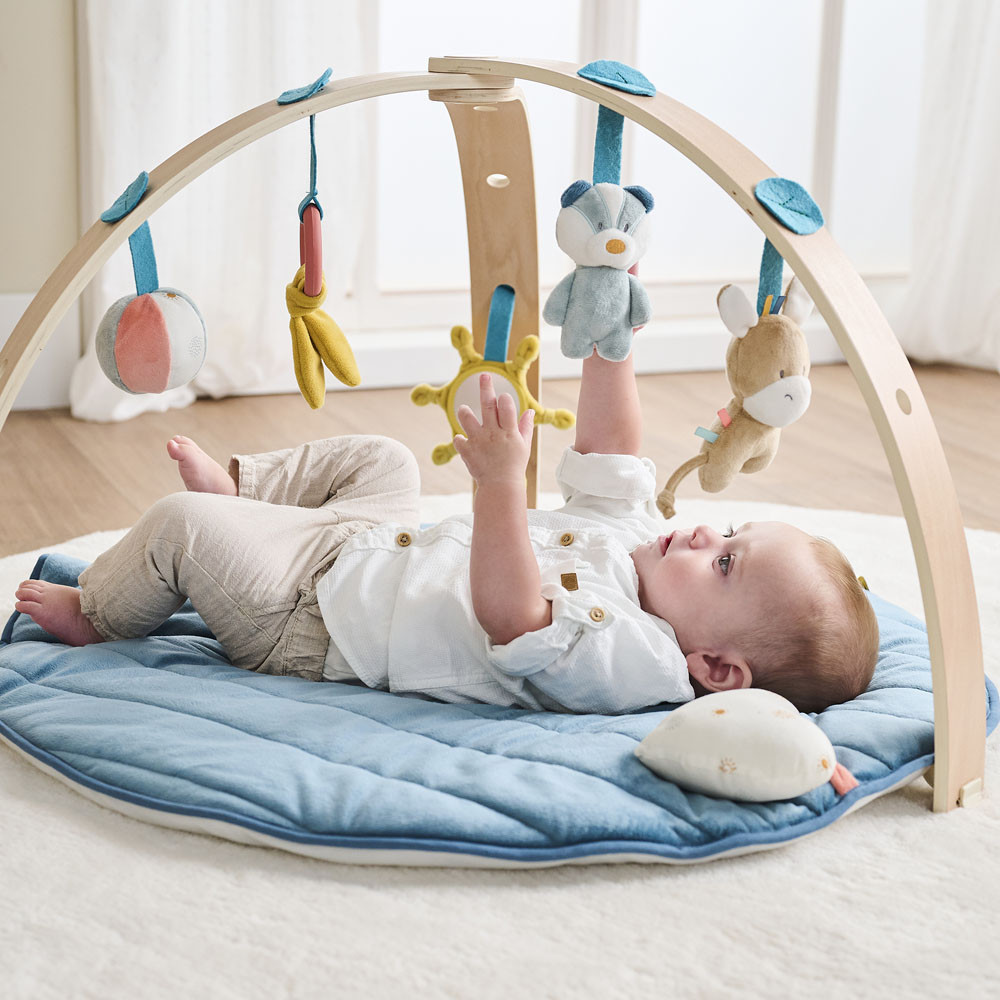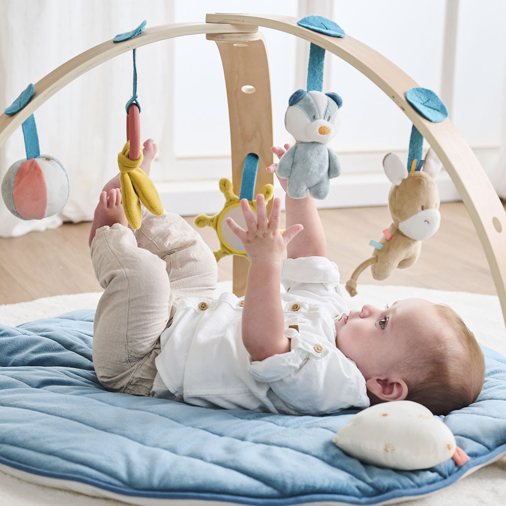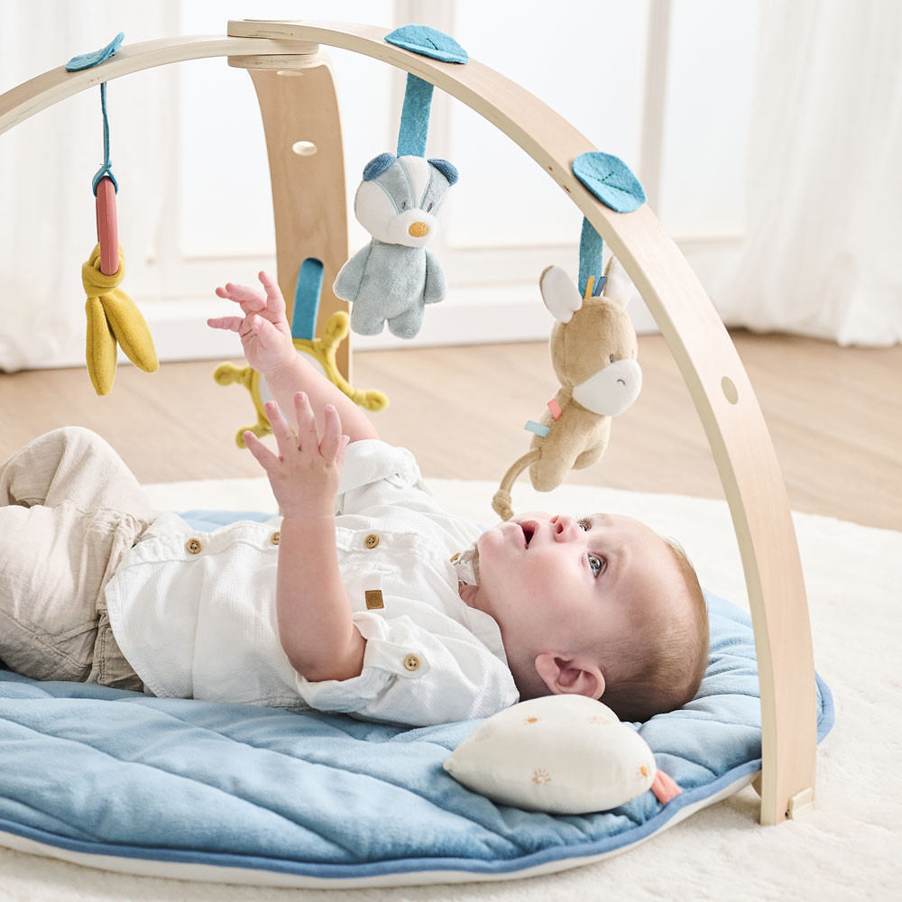 Ez a csodaszép plüss játszószőnyeg ötvözi a prémium puhaságot a természetes anyagok nyugalmával: a kedves Felix és Leo figurák mellett egy natúr fa játékhíd is helyet kapott, amelyről izgalmas, lógó játékok csábítják felfedezésre csöppségedet.