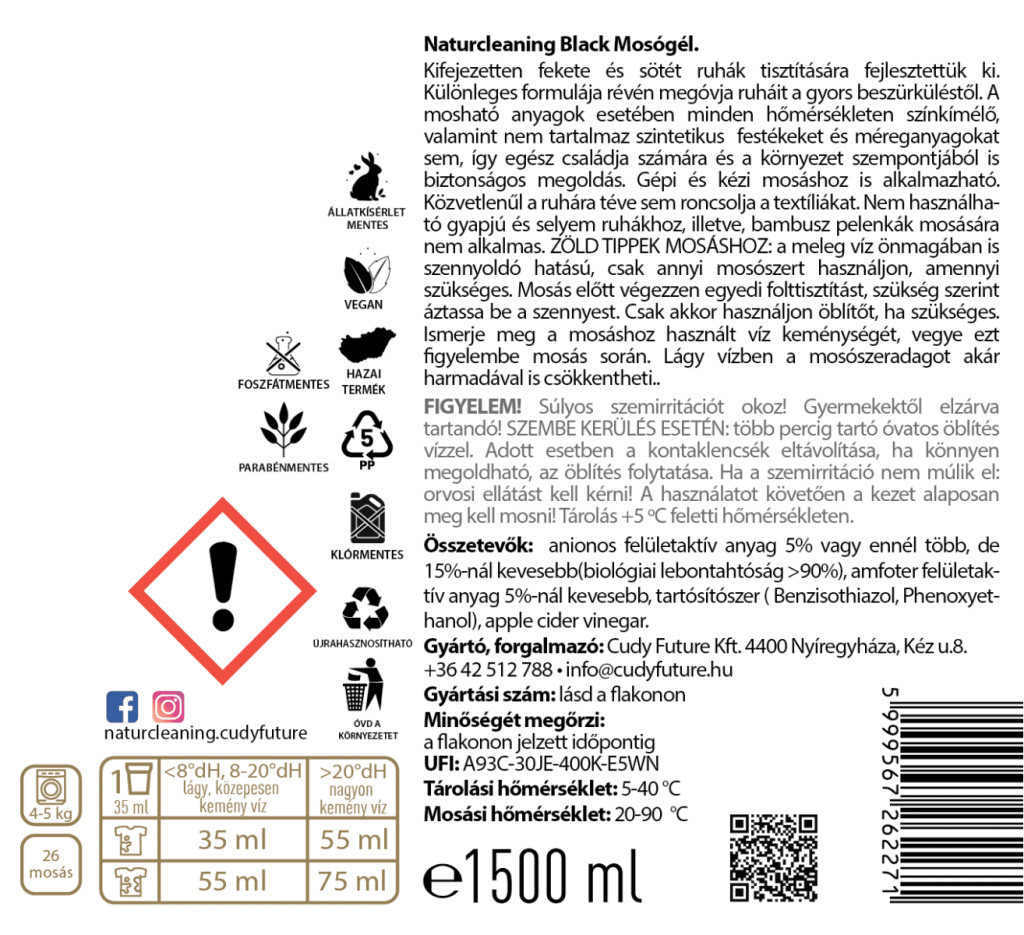 A Naturcleaning Black mosógél különleges formulája kifejezetten fekete és sötét ruhák tisztítására készült. Segít megóvni a ruhák eredeti színét a fakulástól, beszürküléstől, miközben alaposan tisztít és frissít természetes módon. Almaecet tartalma és biológiailag lebomló összetevői révén biztonságos az egész család és a környezet számára is.
