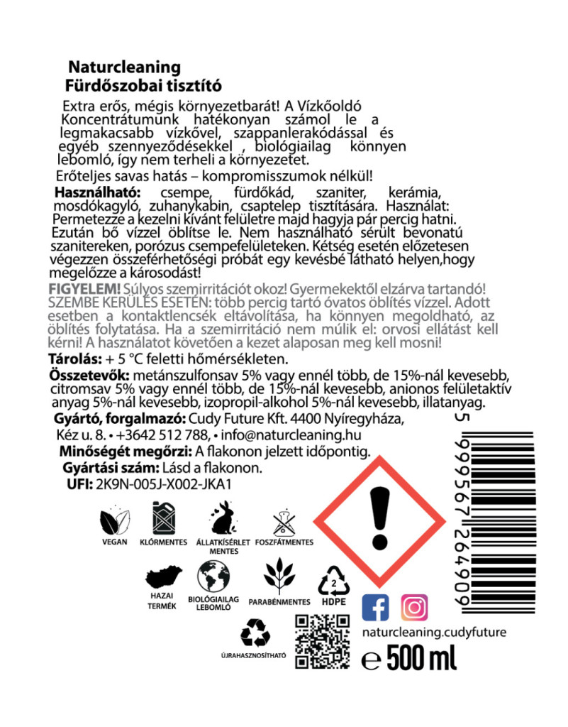 Ha valódi eredményre vágysz a fürdőszobában, de nem szeretnél agresszív vegyszereket használni, a Naturcleaning fürdőszobai tisztító a tökéletes választás. Erőteljes savas hatású vízkőoldó koncentrátum, amely hatékonyan száll szembe a makacs szennyeződésekkel: vízkő, szappanmaradvány, rozsda – mind eltűnnek vele, miközben nem terheli a környezetet.