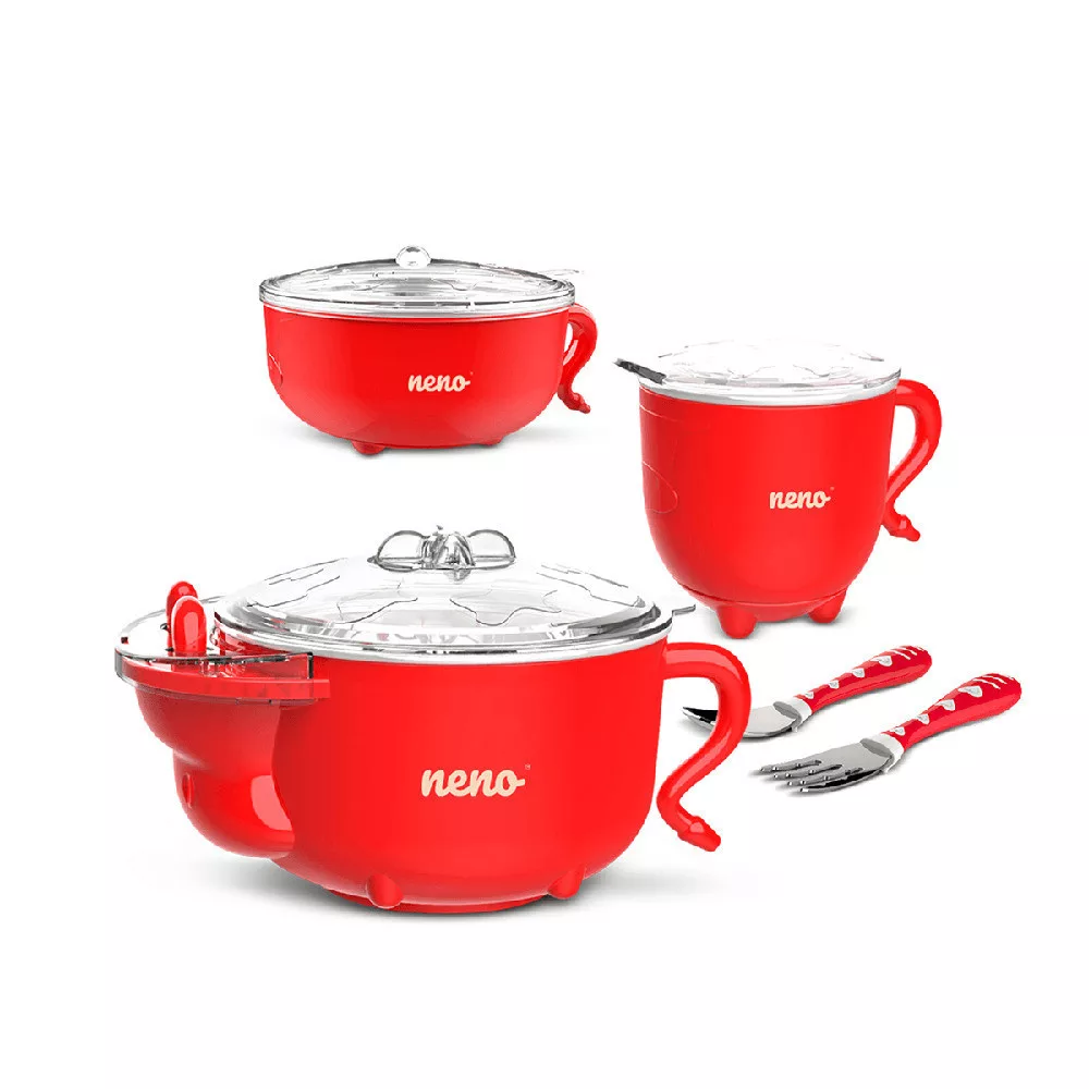 • A készlet tartalma: nagy tál, kis tál, csésze, villa, kanál, csúszásgátló, vízbetöltő kupak, nagy szellőző fedél, kis fedél, csésze fedél