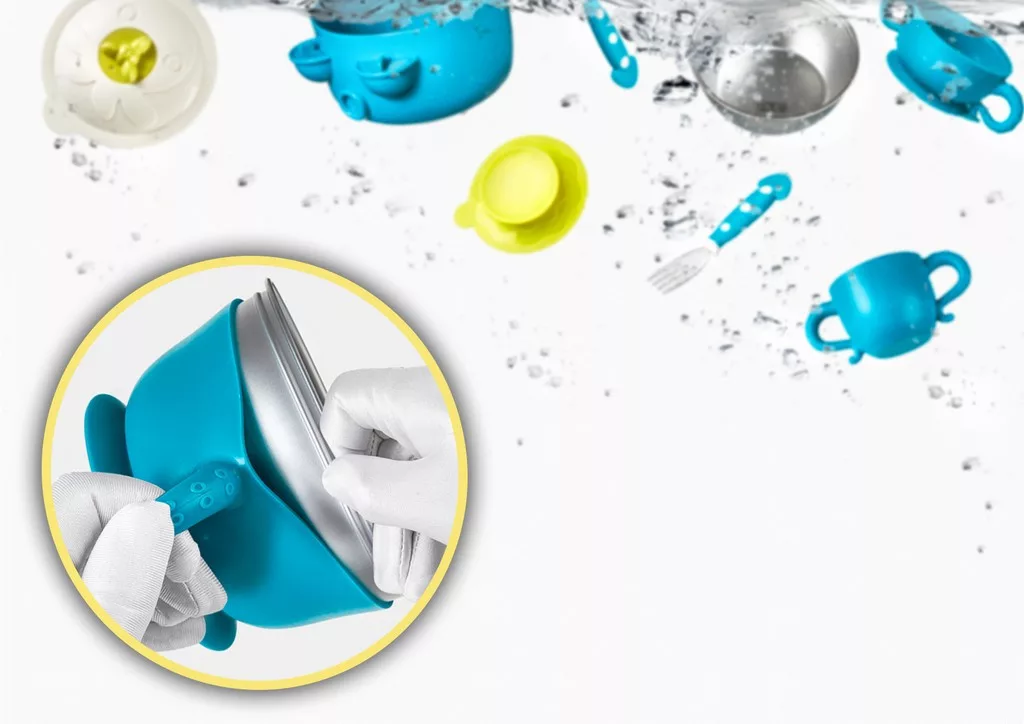 • Az étkészlethez tartozik egy tapadókorong, melynek segítségével biztonságosan tudjuk rögzíteni az asztalon, nem fog csúszkálni miközben gyermekünk eszik