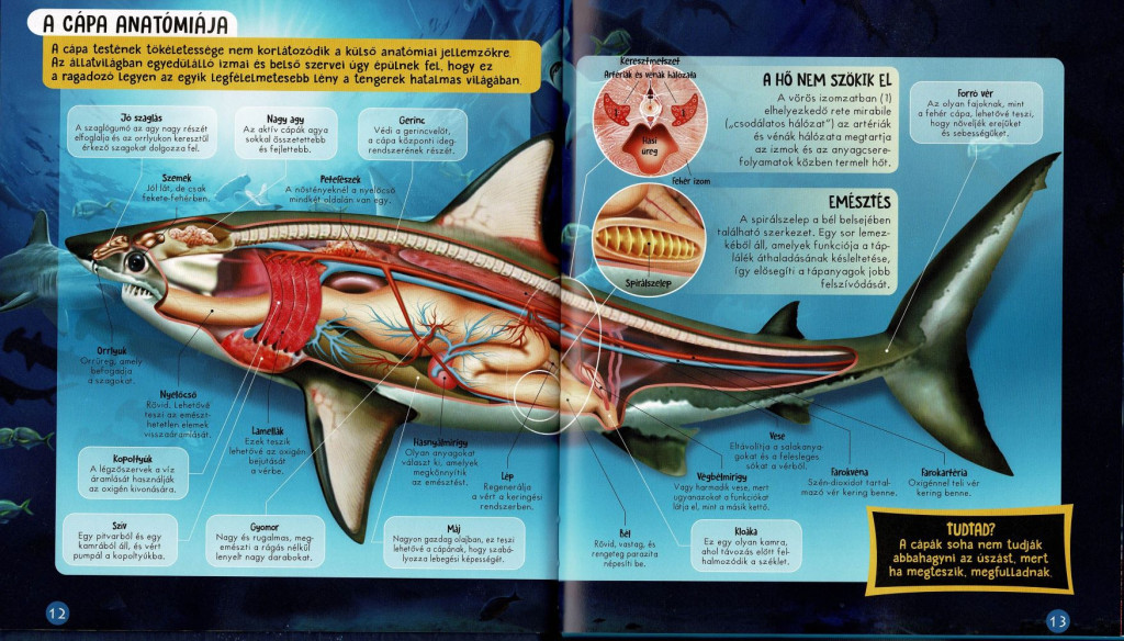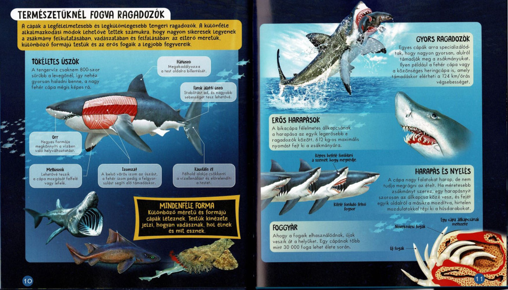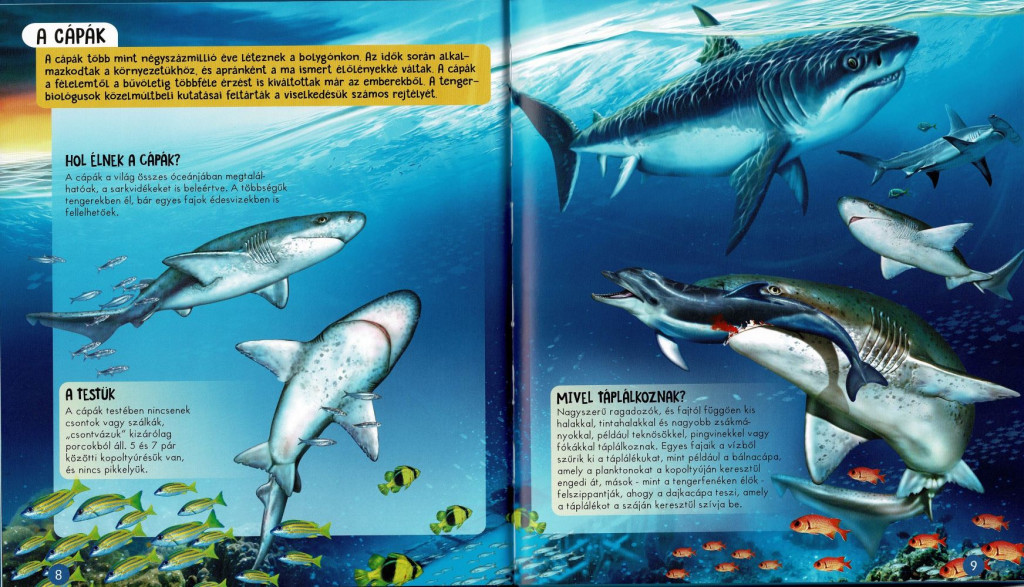 A könyv részletesen bemutatja a cápák anatómiáját, érzékszerveit, táplálkozási szokásaikat és vadászati technikáikat, miközben látványos illusztrációk és fotók segítik a megértést. Megismerhetjük a legnagyobb és legfélelmetesebb ragadozókat, például a nagy fehér cápát, a gyors makócápát és a rejtélyes mélységi fajokat.