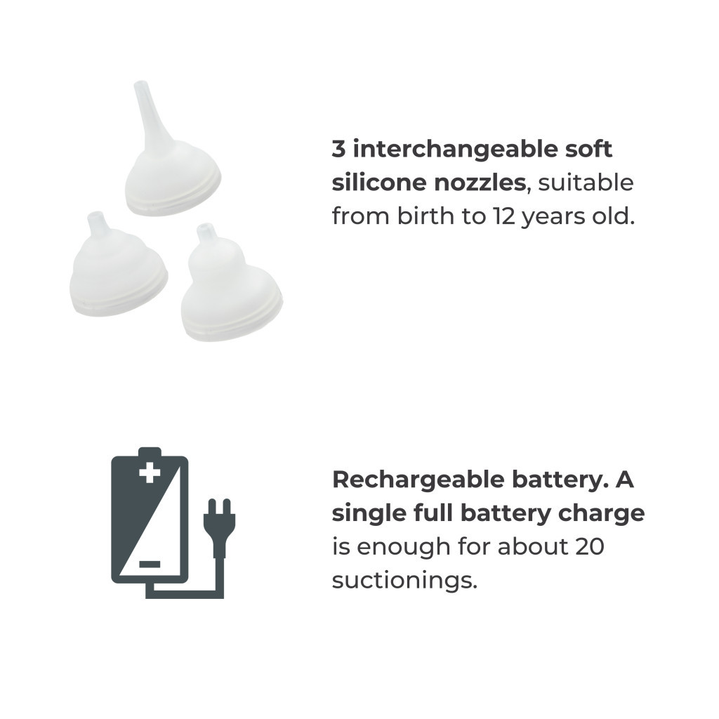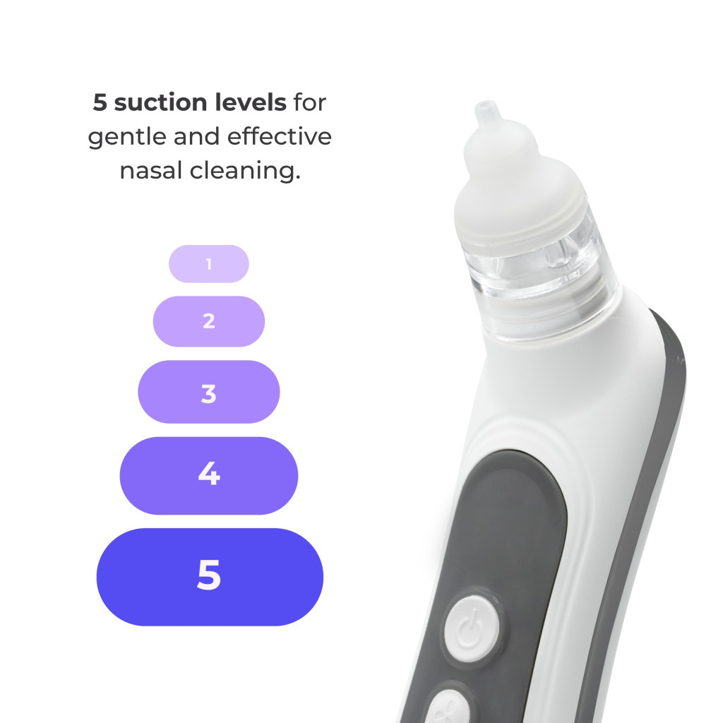 • 5 állítható szívóerőszint: A szívás intenzitása személyre szabható, hogy az egyszerű megfázástól a makacs orrdugulásig minden helyzetben hatékonyan, de kíméletesen működjön, anélkül hogy irritálná a nyálkahártyát.