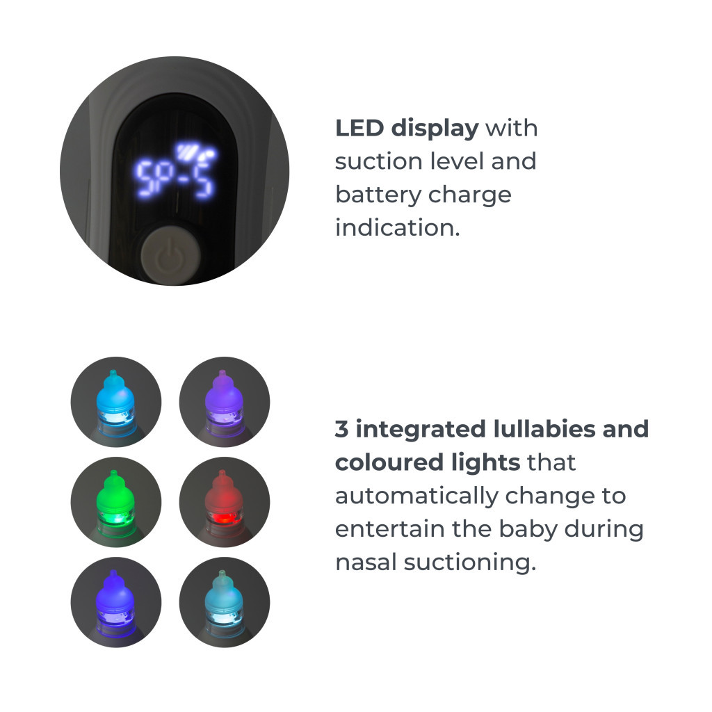 • automatikusan váltakozó színes fények szórakoztatják a kicsiket az orrszívás alatt, csökkentve a stresszt és megkönnyítve a folyamatot.