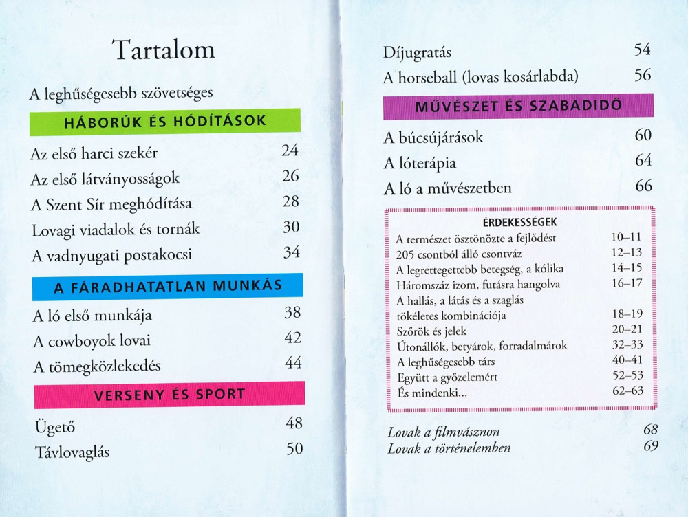 'A lovak története' kötetben izgalmas betekintést nyerhetünk a lovak világába, melyek régóta hűséges segítőink és életünk szerves részei. A lovak szerepe az emberiség történetében meghatározó volt: kezdetben haszonállatként segítették az embereket a mindennapi teendőkben, míg ma már sokszínű szerepet töltenek be, legyen az sport, szabadidős tevékenység vagy egyszerűen házi kedvencként való jelenlét.
